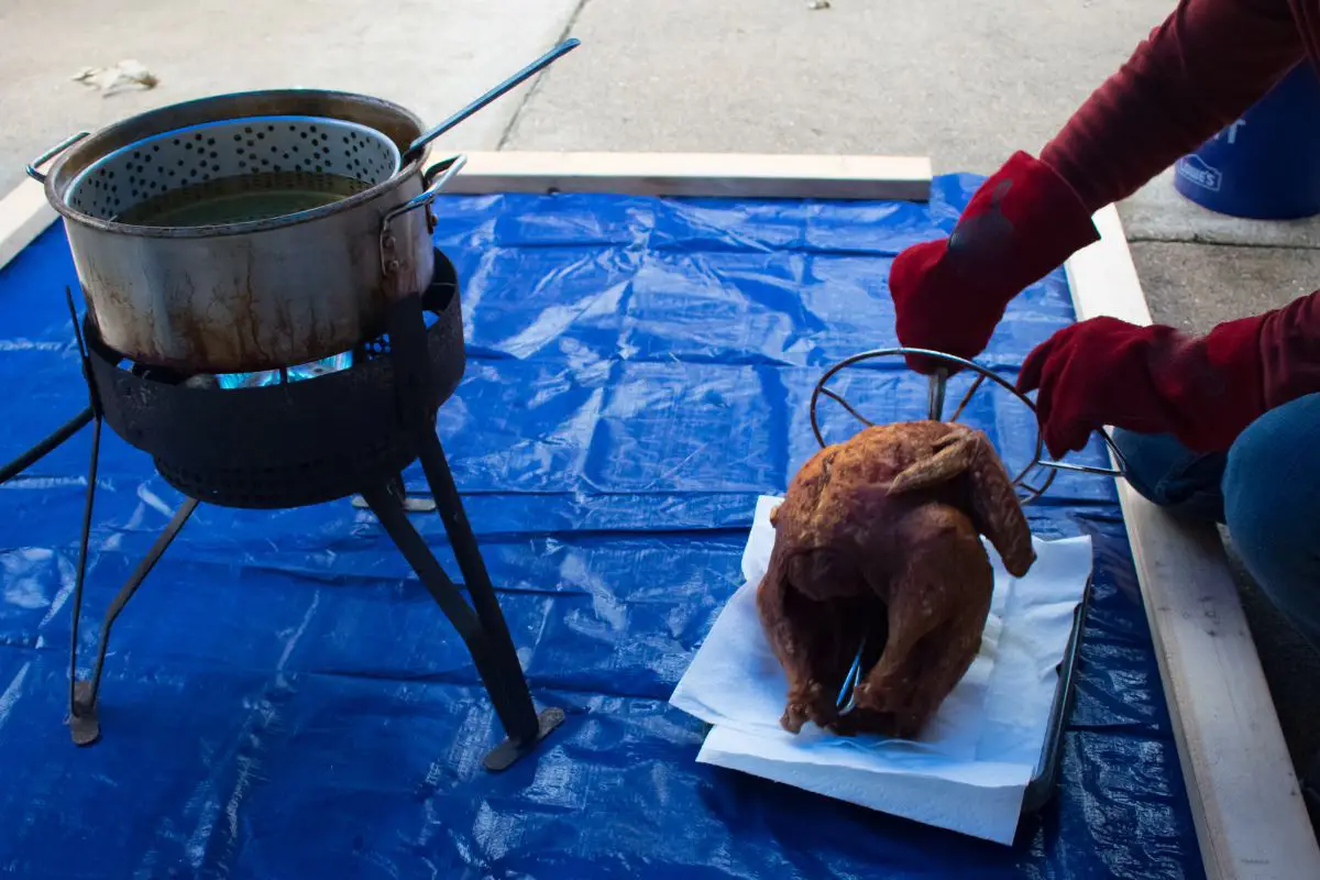 - Location matters: Always deep fry your turkey outdoors, on level ground, away from structures. DO NOT deep fry a turkey in the rain – this is a recipe for disaster, as water + hot oil = explosion.